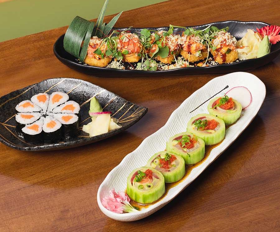While the Ryoshi Roll plays with form, the Sunset Roll plays with crunch. Sushi rice is fried into crispy, golden slabs and piled high with spicy tuna, creamy avocado, tempura flakes and masago. The aptly named Dynamite Roll dares to combine tempura shrimp, smoky grilled eel and…yes… melted cheese. “People see cheese on a sushi roll and hesitate,” said manager Yuki Li. “But one bite, and they get it.”