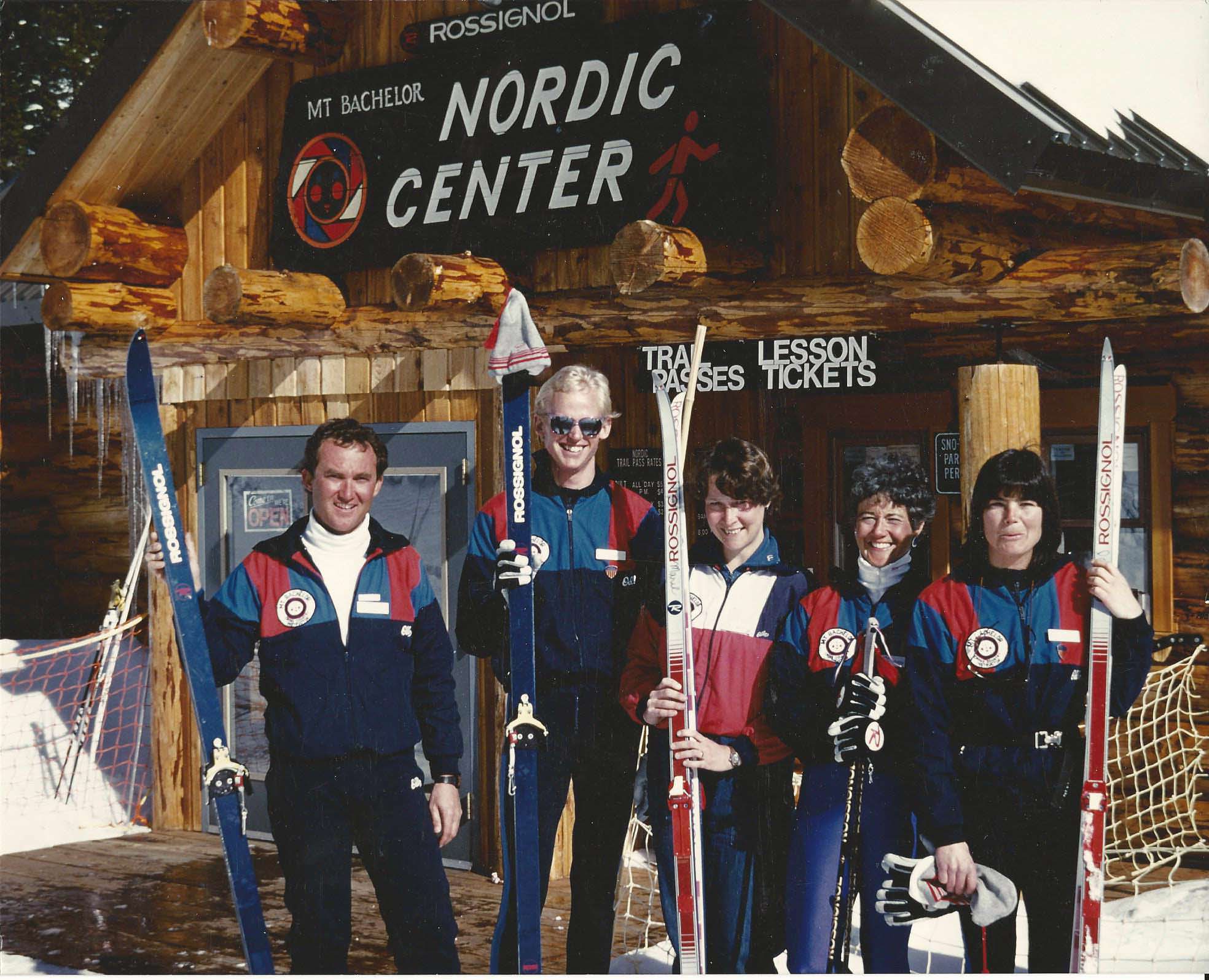 L to R, Mt. Bachelor Nordic teaching staff Doug Cleavenger, Bob Mathews, Marie Clausen, Kathy Ronning and Paj Jones, circa 1987.