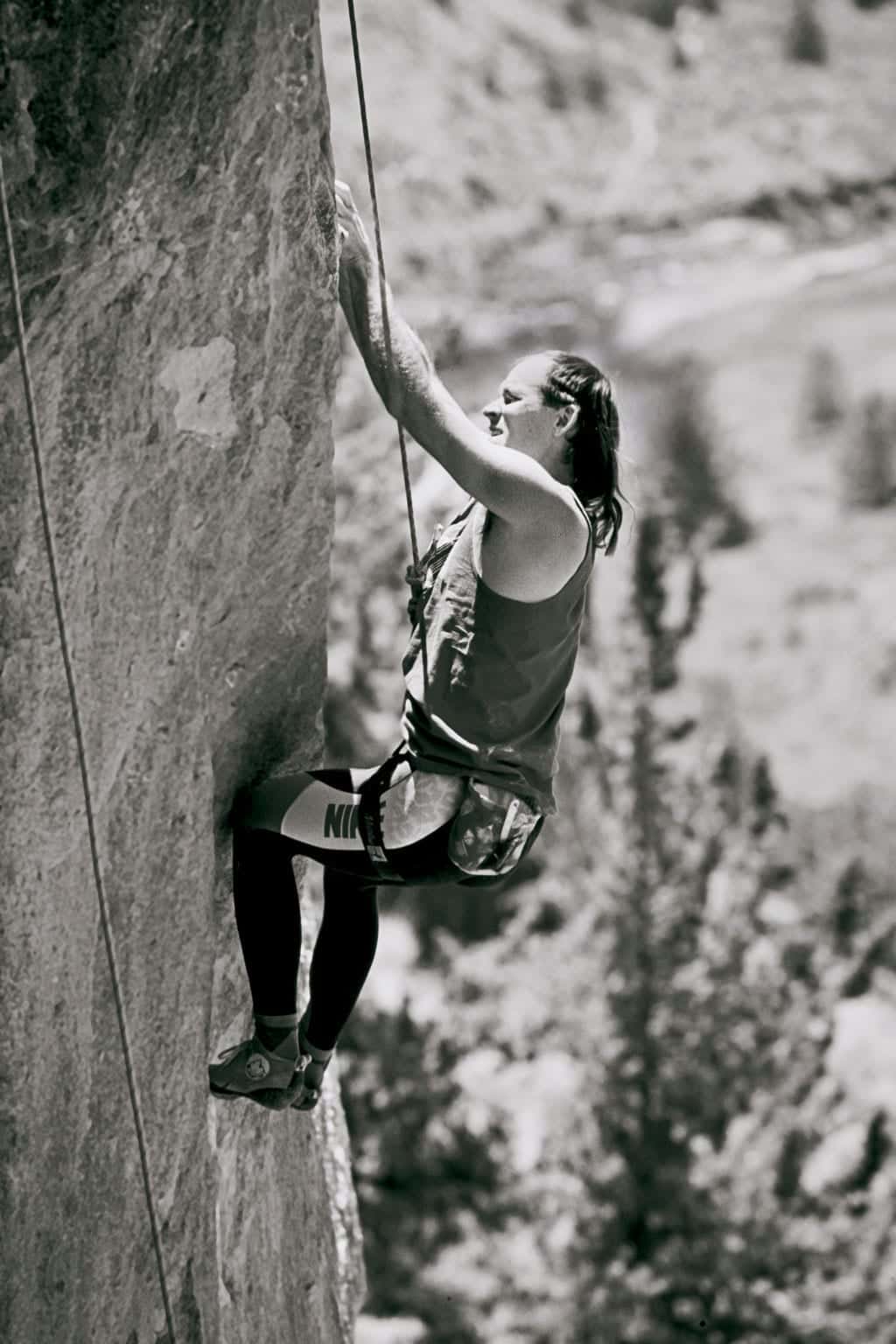 Alan Watts leading a route near Monkey Face at Smith Rock State Park in 1989 for a segment of an adventure sports TV show on sport climbing.