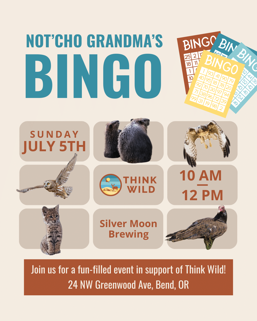Join Think Wild for a wild morning of bingo! Hosted by the amazing Dusty and Stacia, this is Not'Cho Grandma's Bingo - a FUNdraiser supporting Think Wild! Come ready to have fun, win big, and learn about Think Wild and our important work. Reserve a table on Eventbrite and bring your whole crew!