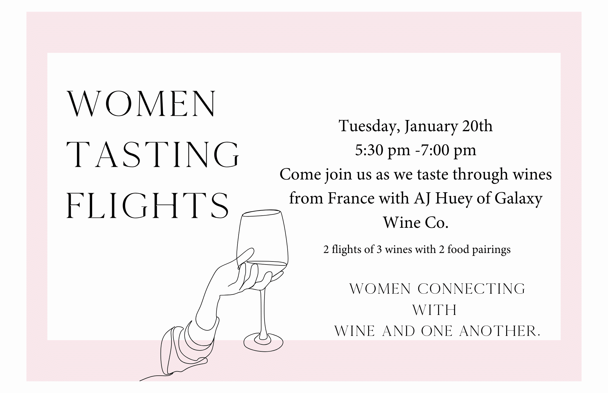 A monthly group of Women connecting with Wine and one another Join us for this month’s Women Tasting Flights event—an evening of connection, conversation, and discovery. Each gathering features two curated wine flights, perfectly paired 2 course dinner, plus insights from a special guest presenter. It’s a chance to explore wine while building community with […]