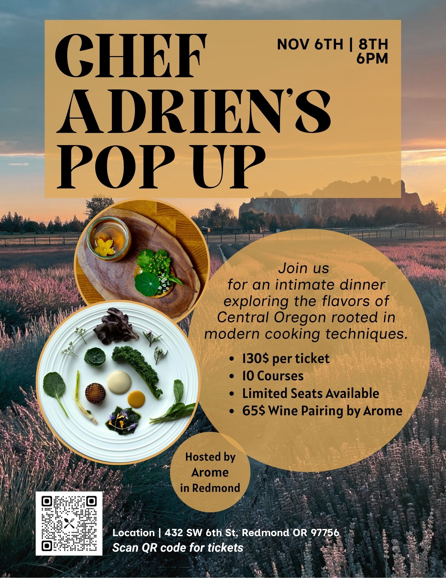 The dinners will take place on November 6th and 8th at Arome in Redmond. The evening will feature a ten-course tasting menu rooted in the micro-seasons and terroir of Central Oregon, with an optional wine pairing curated by the venue. Designed to showcase locally grown, foraged, and fermented ingredients, the menu blends fine dining precision with a deep sense of place.