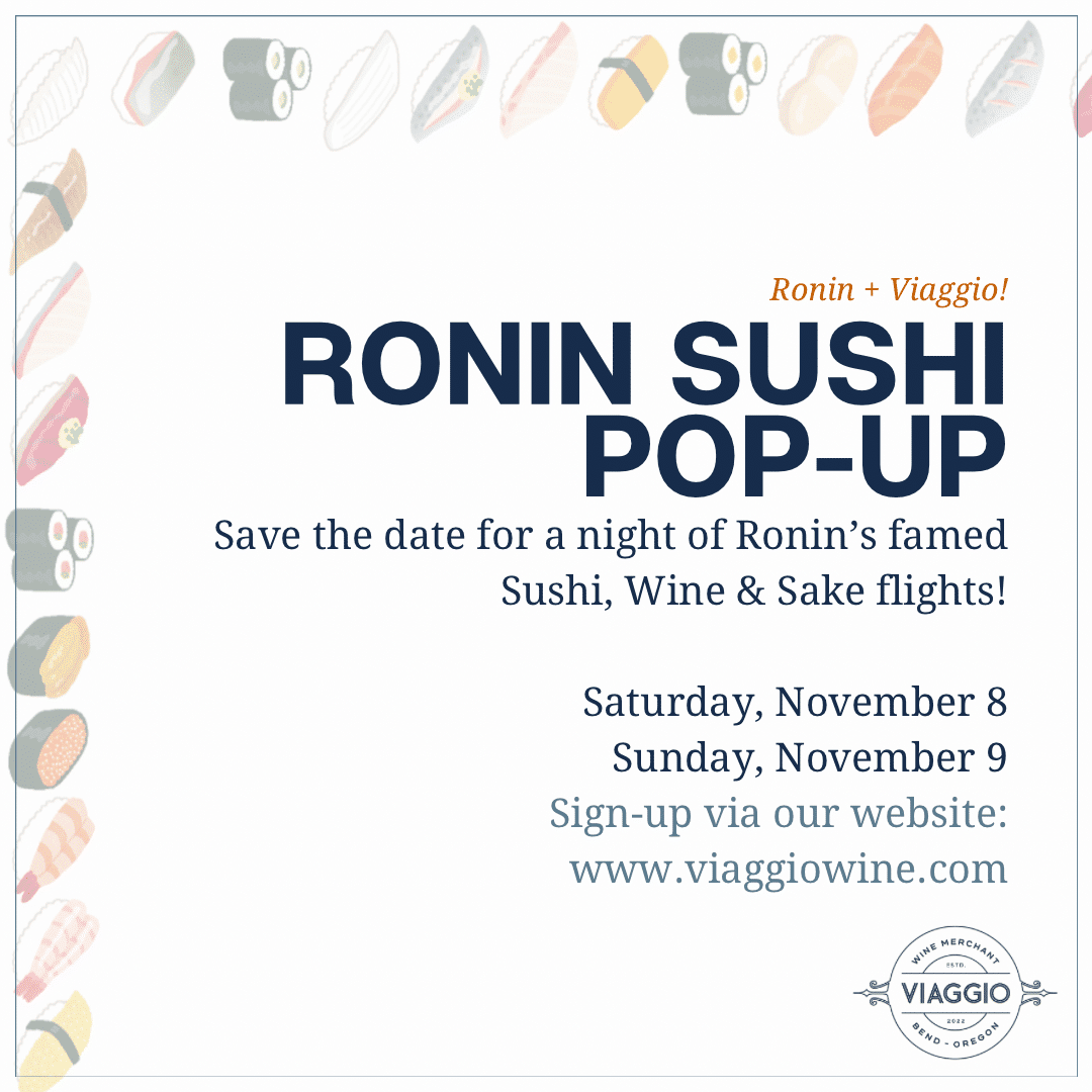 Join us for two memorable nights at Viaggio! For everyone who’s lamented the closing of Ronin on Bend’s west side, here’s your long-awaited opportunity to enjoy Scotty Byer’s amazing cuisine once again. (And for first-timers, you’re in for a real treat!) Saturday 11/8 we’ll have two seatings, 4:30pm and 7:30pm, accommodating only 20 people each. Sunday 11/9 we’ll have one seating at 5:30pm also limited to 20 people. Each seat for this one-of-a-kind, multi-course experience will be $200, excluding gratuity. Beverages, including wine and sake pairings, available for an additional charge. This will sell quickly, so reserve your seats now!!