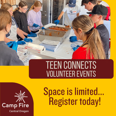 Teen Connects with Camp Fire Central Oregon offers stand-alone service projects and fun outings for youth ages 12 through 17 and who are looking for awesome volunteer experiences. We are excited for any teen to join us to make a difference and make friends! Teens are invited to come volunteer, getting out and about the community, lending a hand with local nonprofits and other amazing organizations. Great for building job skills, resumés, and college applications! Visit the Teen Connects website to see what’s happening on this day and make sure to register soon because spots do fill up! Happening this day: Family Kitchen Meal Prep!