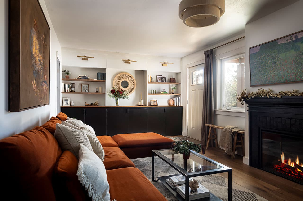 They added the decorative black-glazed brick fireplace from California-based Arto Brick in the living room. Celeste found the heavy wooden oversized mirror, a focal point of the room, at a Bend thrift shop. Tim, a multitalented craftsman with a background in custom metal fabrication, made the steel and stained-wood built-in cabinets on the opposite wall, which is both functional and stylish. “In small spaces, playing with scale can be important. I feel like we’re doing that with these two opposing elements [of steel and wood],” said Celeste.