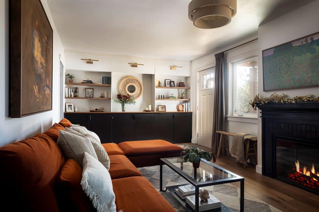 Next image → iron-roots—high-res_-6 The living room was once the main school room, and features custom cabinets made by Tim McGowan.