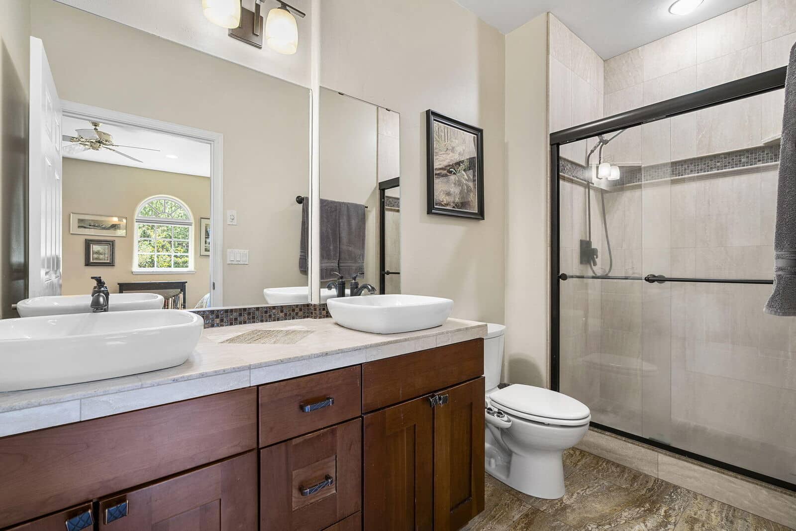 Step inside and be greeted by soaring 16-foot ceilings and an open-concept gourmet kitchen, perfect for entertaining. The kitchen boasts a massive wraparound bar, granite countertops, and a unique crushed granite sink. Enjoy formal dinners in the elegant dining room, or unwind in one of two spacious primary suites on the main level. An executive office or third bedroom offers beautiful golf course views. Downstairs, you’ll find a large guest suite or bonus room.