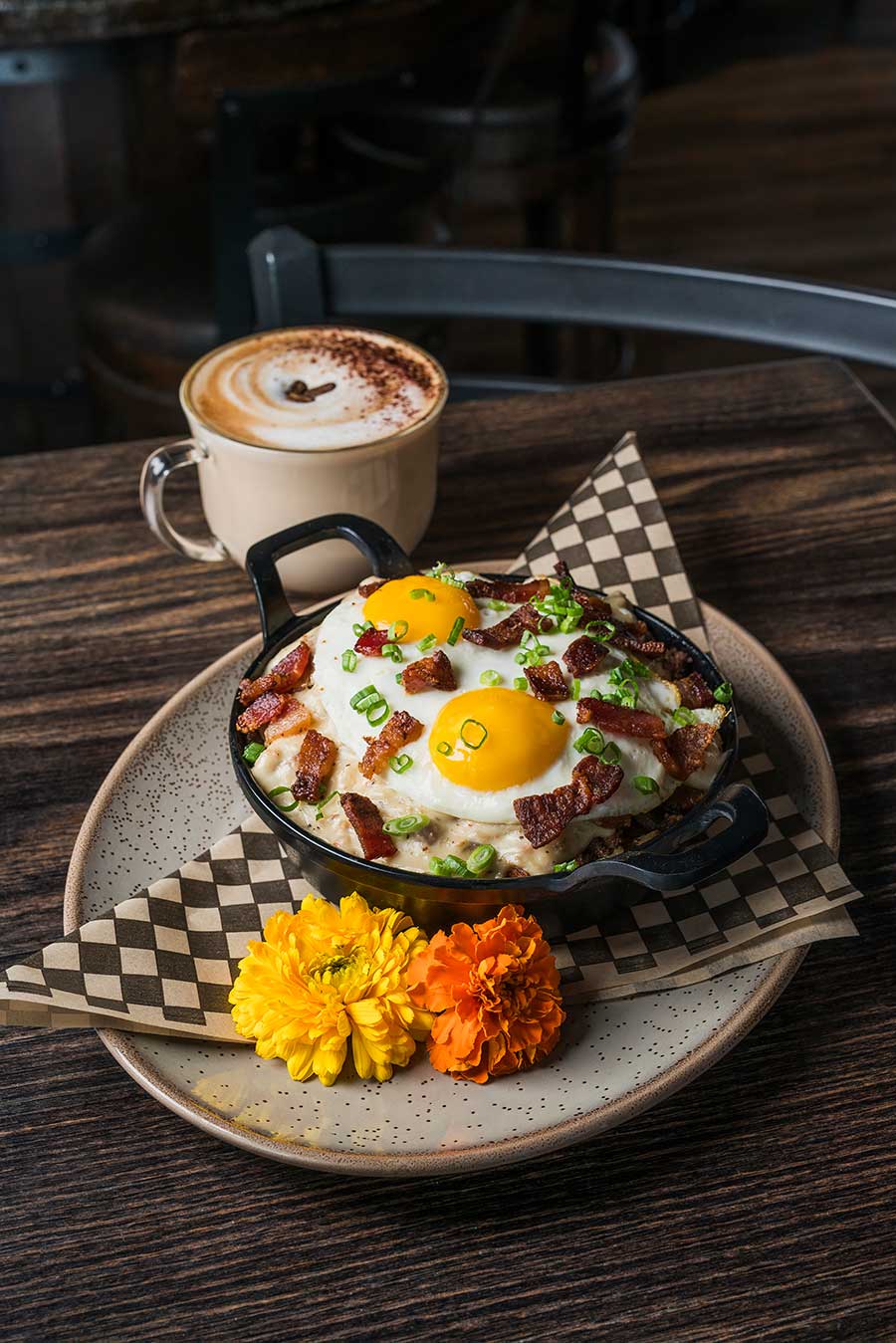 Brioche, shaved manchego, confit garlic, marinated zucchini, heirloom tomato, sautéed chard, baked free-range egg, lemon olive oil drizzle and Jacobsen’s smoked sea salt (v)